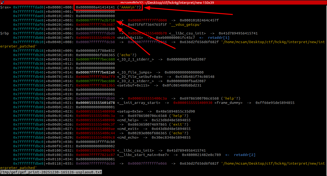 0x0000555555603000 0x0000555555605000 0x0000000000002000 0x0000000000004000 rw- /home/mcsam/Desktop/ctf/hck4g/interpret/new/interpreter_patched